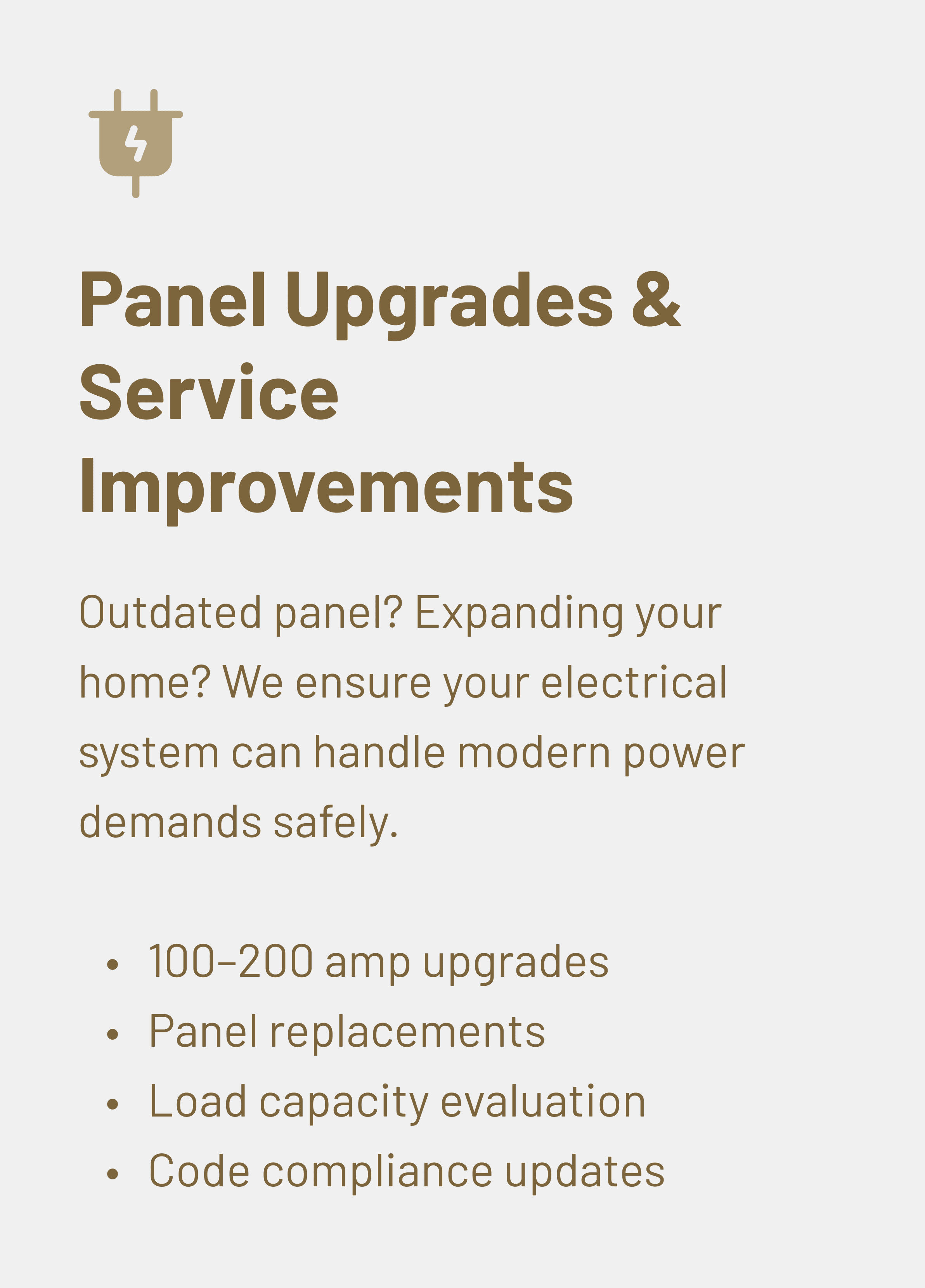 Tripping breakers, outdated panels, flickering lights, or planning an upgrade? We diagnose the issue, explain your options clearly, and deliver safe, code-compliant solutions.